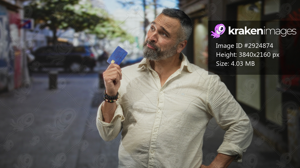 Man holding creditcard up with hand on hip, smiling with grey hair and beard in city street; confidence financial freedom.