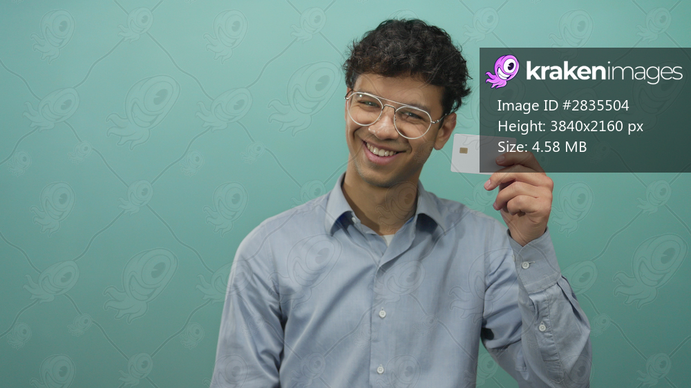 Man holding creditcard with visible chip in studio against green wall while smiling warmly; confidence.