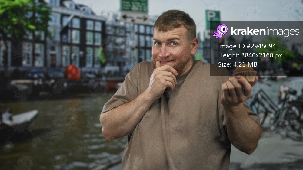 Man holding cupcake, hand to mouth on street by canal and bicycles in amsterdam; hesitation temptation.