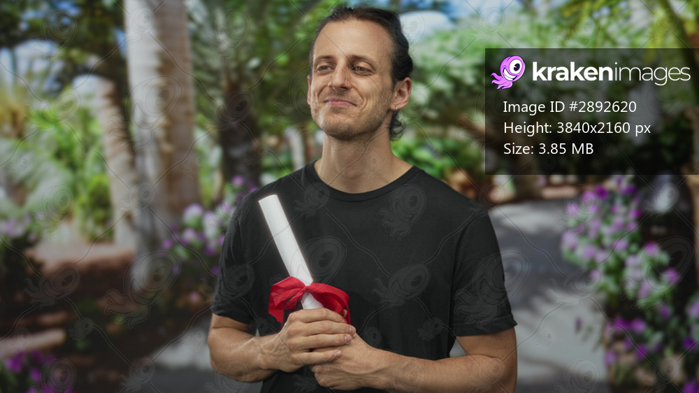 Man holding diploma with red ribbon in a park path, hands clasping a white scroll and smiling while wearing a black t shirt; quiet pride achievement.