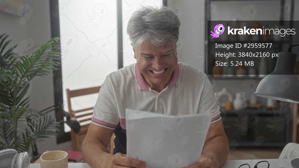 Man holding document with clenched fist and broad smile in studio at desk with mug and headphones; joy success.