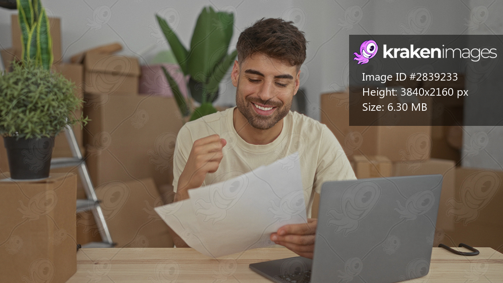 Man holding documents while seated at wooden table beside laptop among cardboard boxes inside building; excitement.