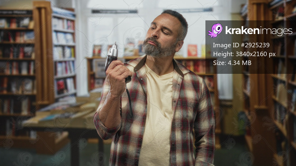 Man holding drill in library building, hand gripping tool and plaid shirt visible; confidence craft.