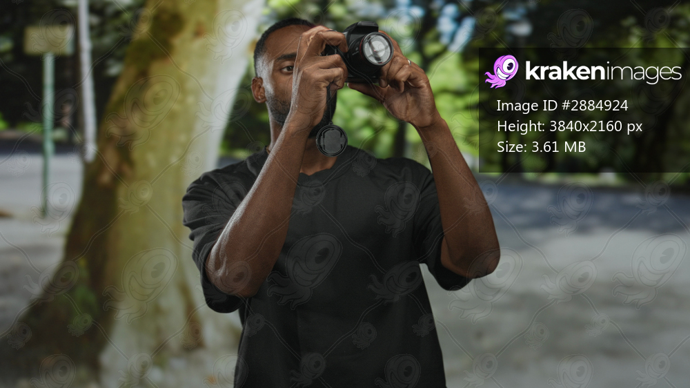Man holding dslr camera to his eyes on a tree lined city street with a bus and sidewalk, adjusting lens and framing a shot; concentration urban exploration. - Kraken Images