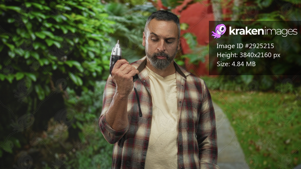 Man holding electric drill in right hand on street path framed by green park foliage, beard and carpenter flannel visible; determination craftsmanship. - Kraken Images