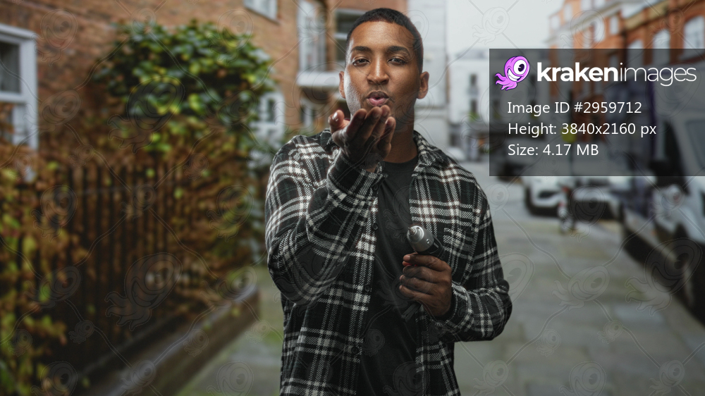Man holding electric screwdriver and blowing from hand on a street, hands visible and plaid shirt; confidence skill craft.