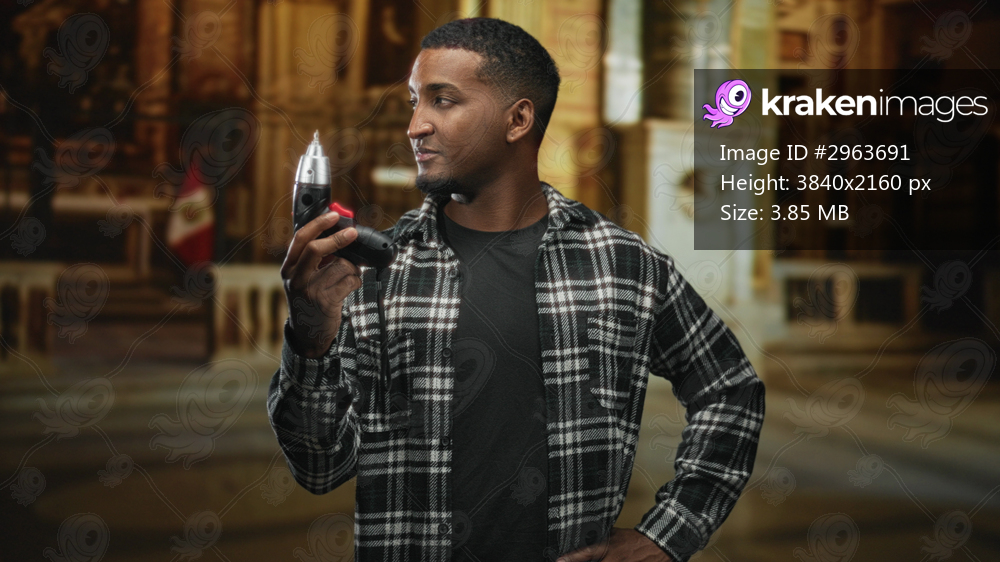 Man holding electric screwdriver with hand on hip inside a building cathedral interior, plaid shirt and focused gaze, peruvian flag visible; contemplation craft. - Kraken Images