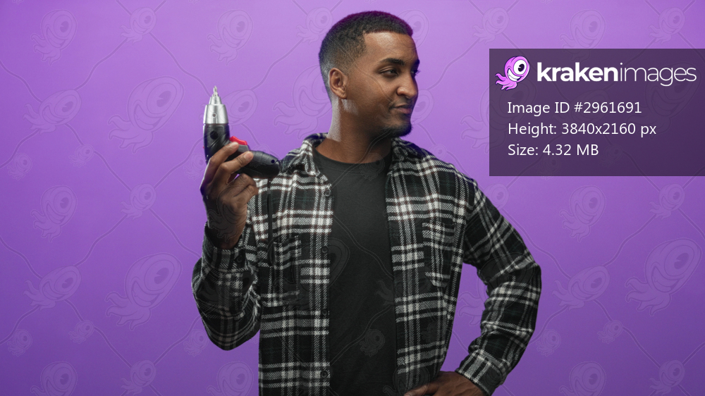 Man holding electric screwdriver in hand with other hand on hip inspecting the tool in studio; confidence skill.