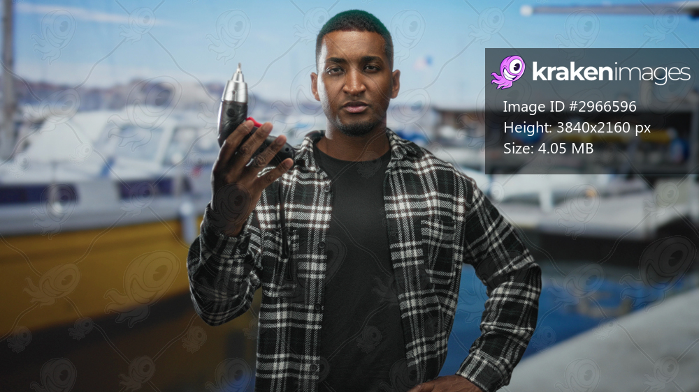 Man holding electric screwdriver in studio with staged marina dock backdrop, hand raised and gripping tool while posing; confidence.