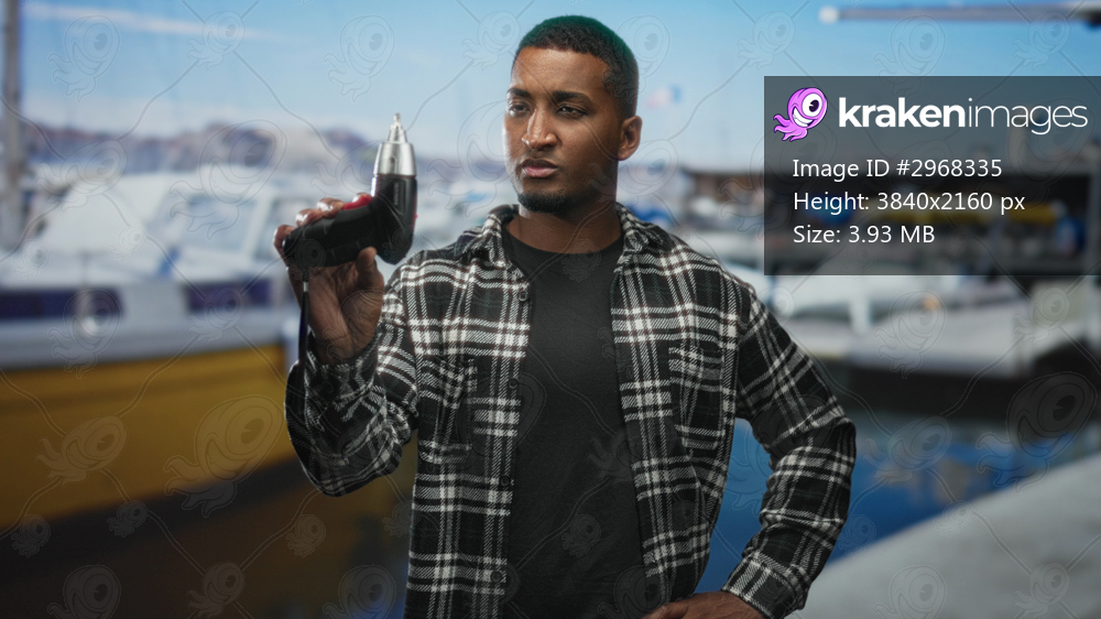 Man holding electric screwdriver in studio with staged marina dock backdrop, hand raised and gripping tool while posing; confidence.