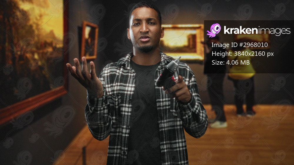 Man holding electric screwdriver inspecting the tool and gesturing with hands inside a gallery building; concentration repair.