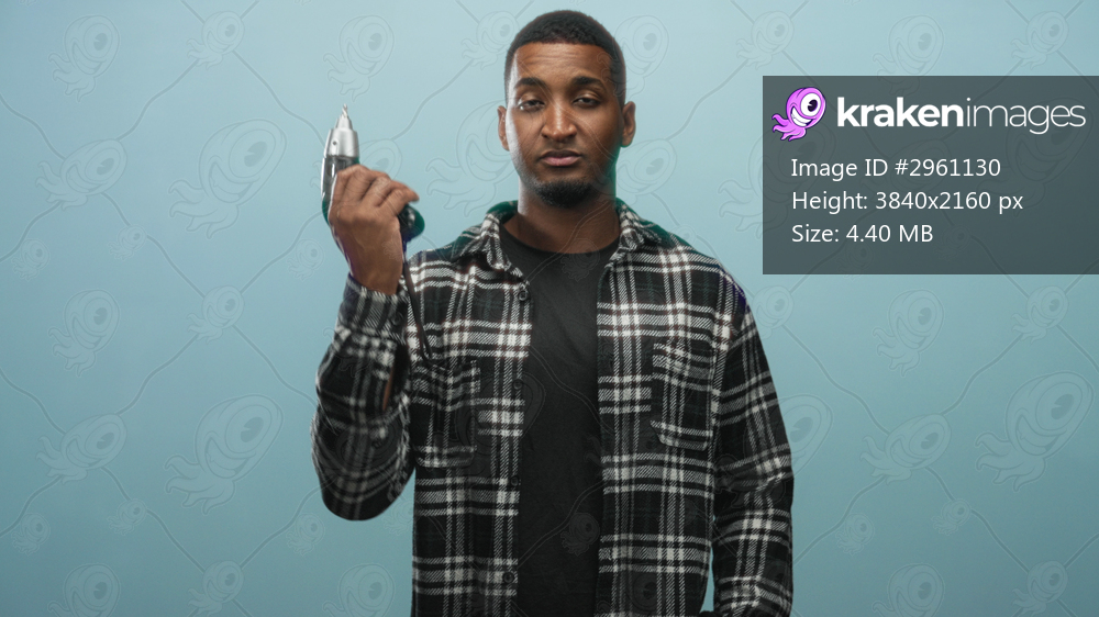 Man holding electric screwdriver near temple in studio wearing plaid shirt and black tee with neutral blue backdrop; concentration.