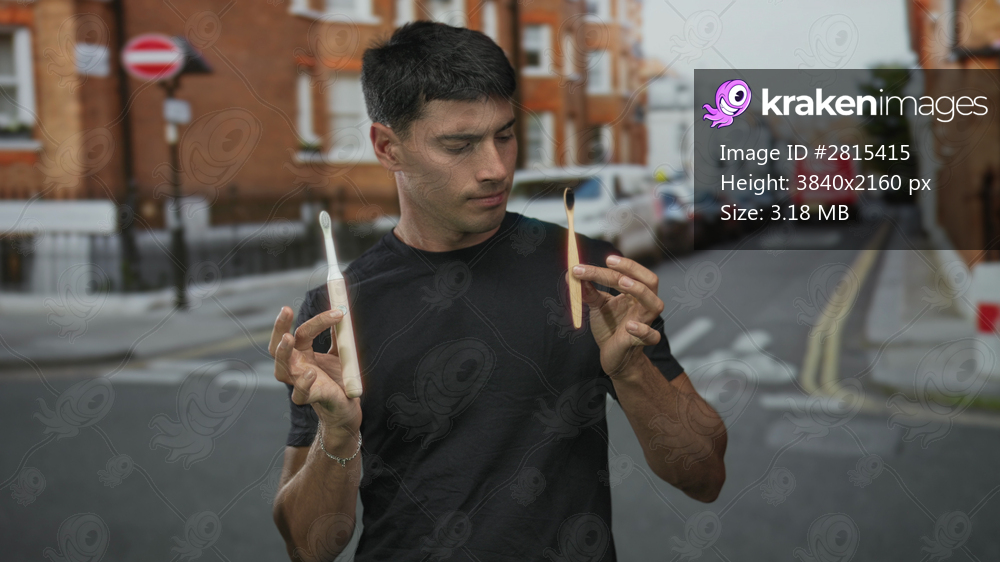 Man holding electric toothbrush and bamboo toothbrush while comparing oral care tools on street; sustainable hygiene curiosity.