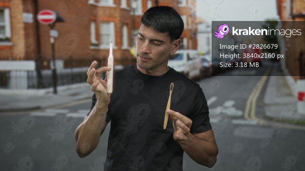 Man holding electric toothbrush and bamboo toothbrush while comparing oral care tools on street; sustainable hygiene curiosity.