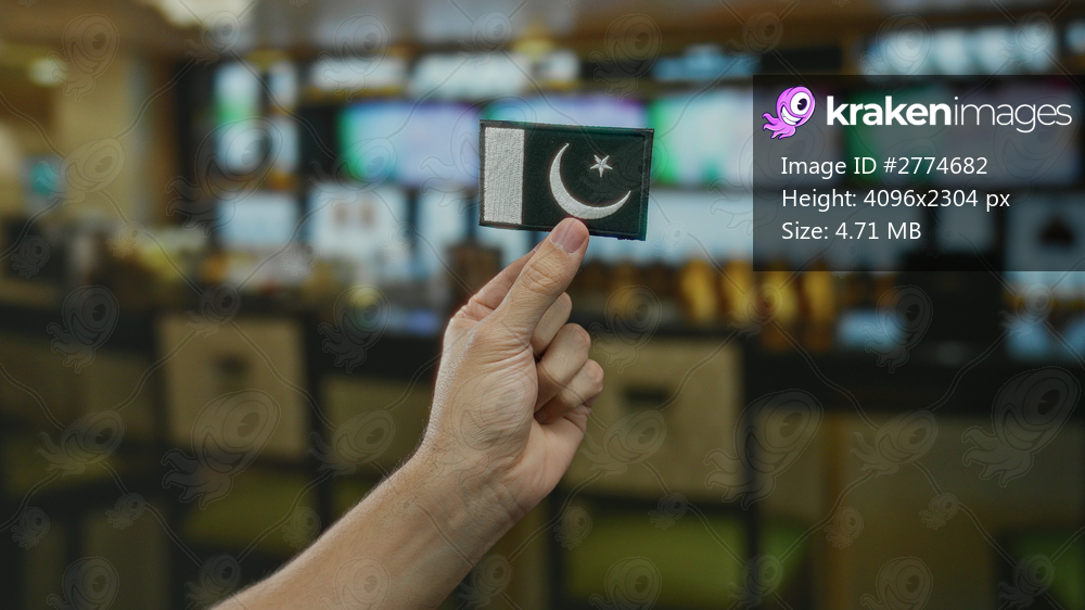 Man holding embroidered pakistan flag patch indoors in a coffee restaurant with a blurred background.