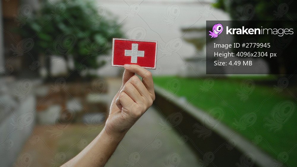 Man holding embroidered swiss flag patch with caucasian hand in a city outdoor setting against a blurred green background, symbolizing swiss culture and identity. - Kraken Images