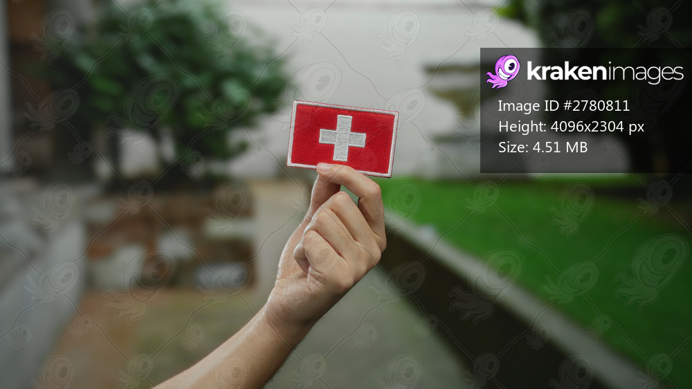 Man holding embroidered swiss flag patch with caucasian hand in a city outdoor setting against a blurred green background, symbolizing swiss culture and identity. - Kraken Images