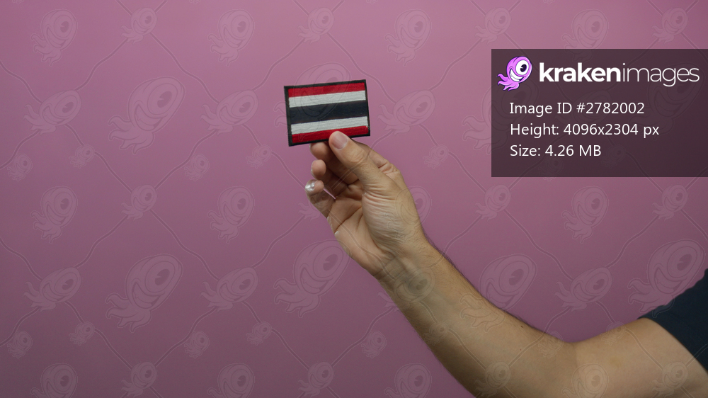 Man holding embroidered thailand flag patch with hand against pink isolated background implying cultural focus and national identity.