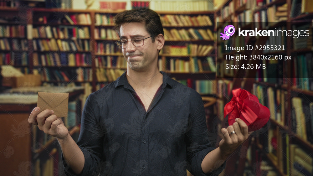 Man holding envelope and red heart gift box in library, holding both hands out in a puzzled pose; romantic melancholy.