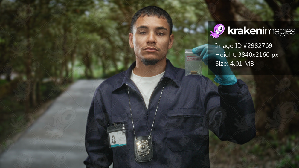 Man holding evidence bag and gloved hand displaying a bullet while wearing badge and id card on lanyard in forest; duty vigilance.