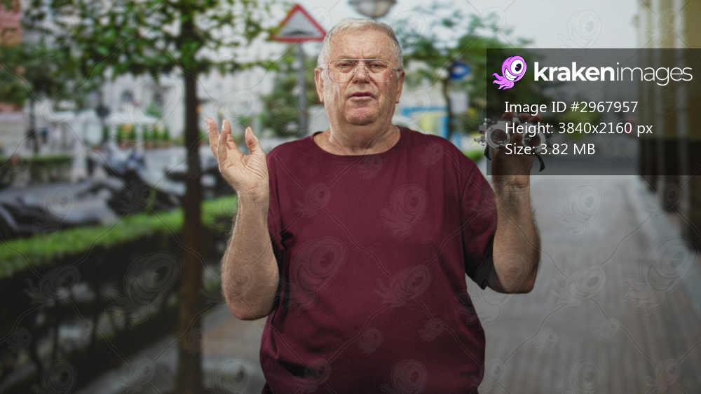 Man holding eyeglasses trial frame and shrugging with one hand on a busy city street near scooters and sidewalk cafes, wearing burgundy shirt; confusion diagnosis. - Kraken Images