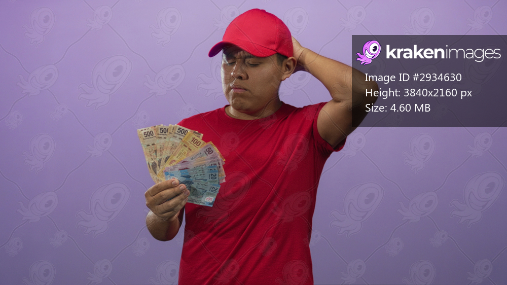 Man holding fan of mexican pesos bills and hand behind head in purple studio; uncertainty finances dilemma.