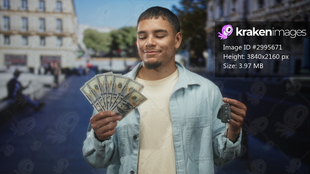 Man holding fanned us dollar bills in one hand and car keys in the other on street, smiling confidently at camera; confidence success.