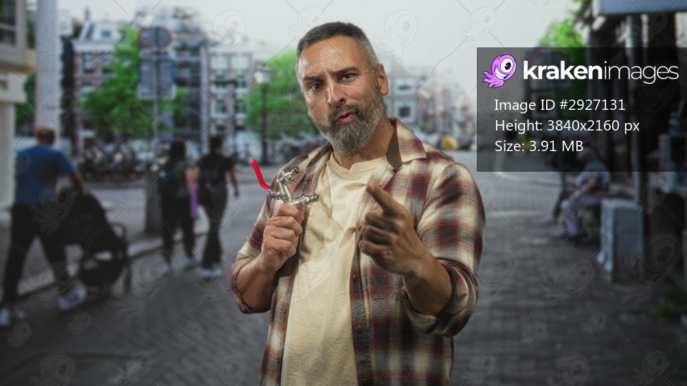 Man holding faucet with one hand and pointing finger on city street, plaid shirt and beard visible; confidence craft.