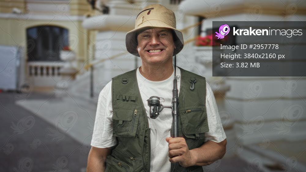 Man holding fishing rod with bare hand, smiling in front of building, wearing fishing vest and bucket hat; leisure contentment.