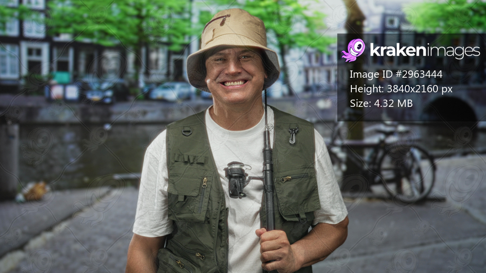 Man holding fishing rod and reel, wearing a fishing vest and bucket hat, smiling while standing on a street beside a canal with a bicycle and arched bridge; contentment leisure hobby. - Kraken Images
