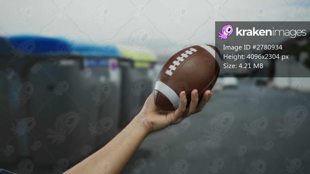 Man holding football near recycling bins on urban street with focus on hand and ball against city backdrop showcasing outdoor sports culture.
