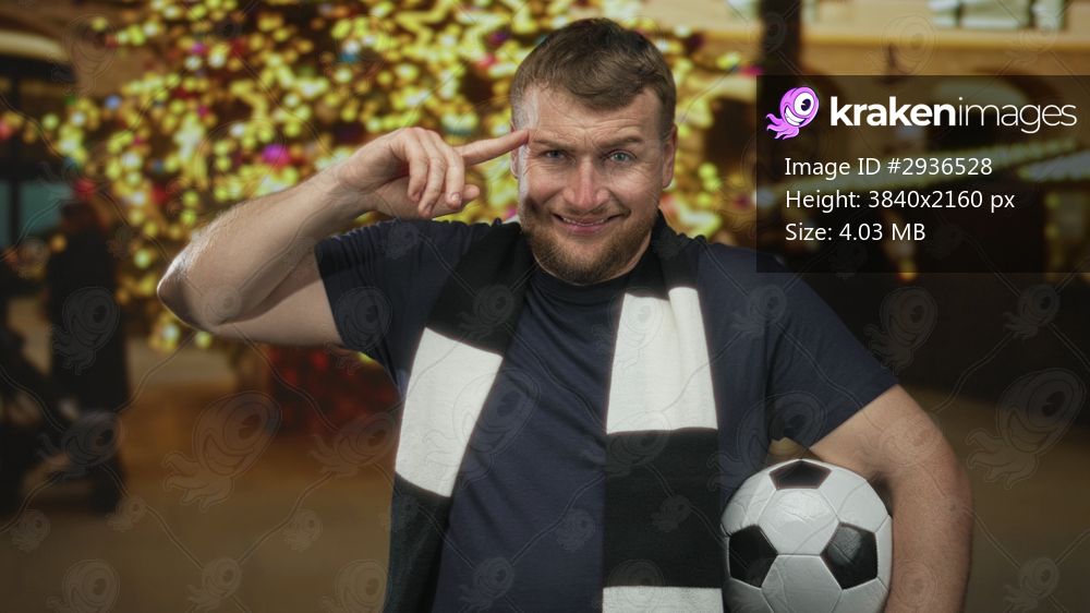 Man holding football and points finger to temple on street with holiday lights and blurred crowd; fan culture holiday mischief.