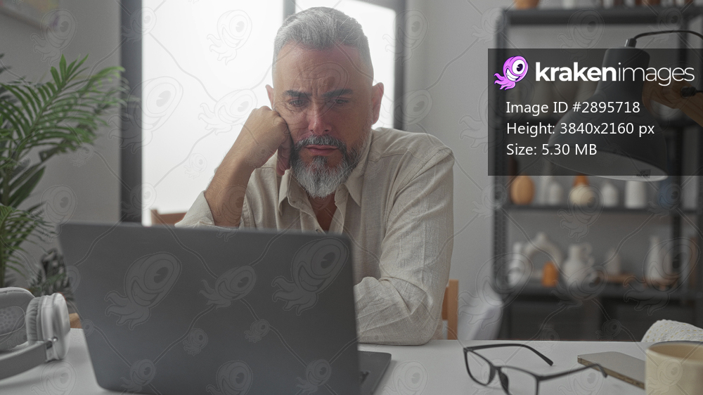 Man holding forehead at laptop with closed eyes in building, headphones and glasses on desk, potted plant nearby; work stress.