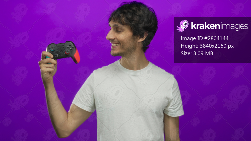 Man holding game controller with colored grips in purple studio; digital entertainment excitement fun.