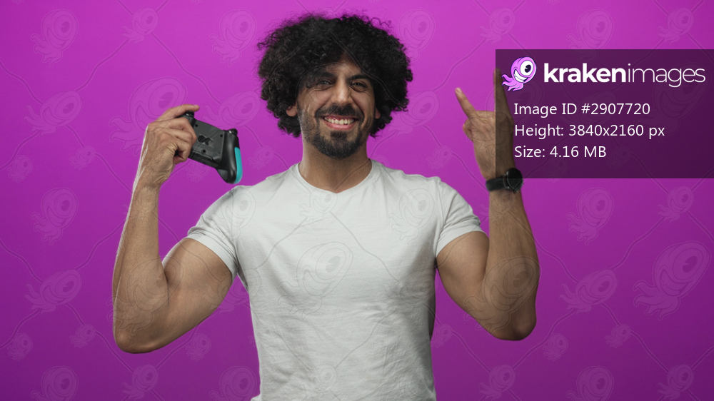 Man holding game controller and flashing rock horns with visible biceps in magenta studio; playful excitement.