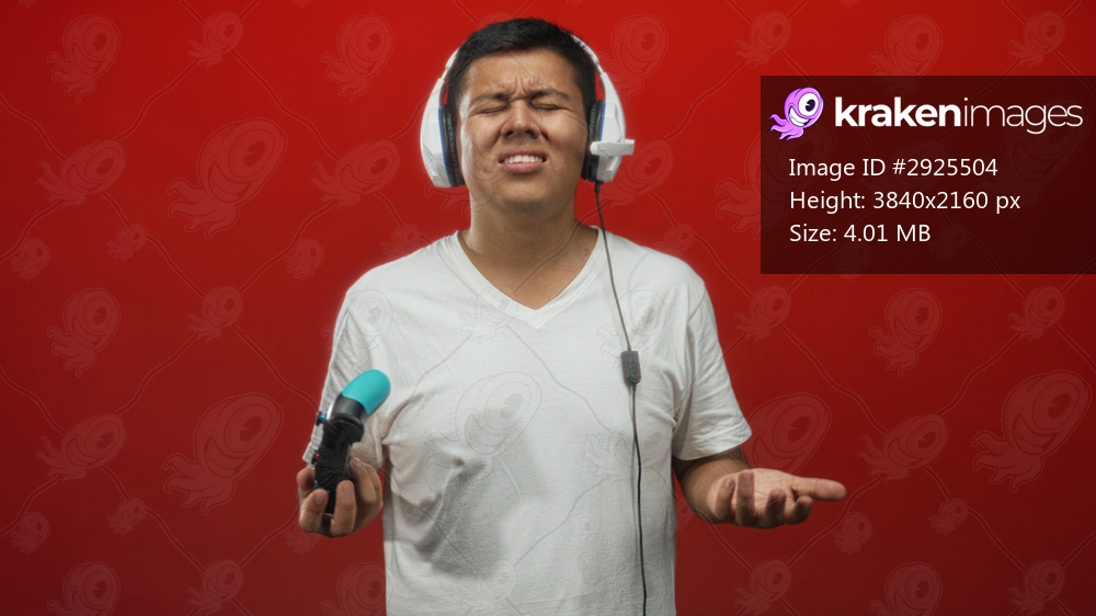 Man holding game controller and wearing white headset while standing and playing against red studio wall; concentration.