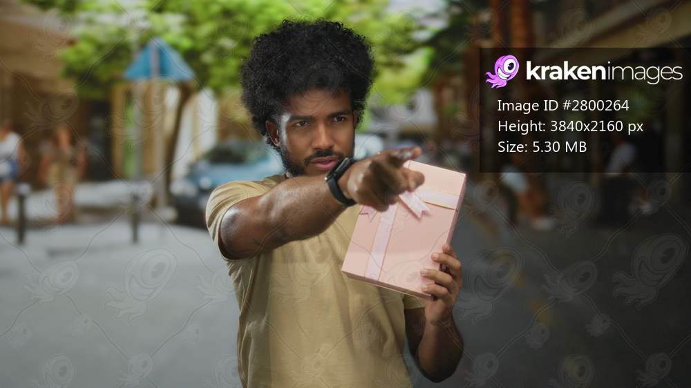Man holding gift box points on bustling city street, blending urban lifestyle with personal interaction, highlighting a thoughtful moment in outdoor setting. - Kraken Images