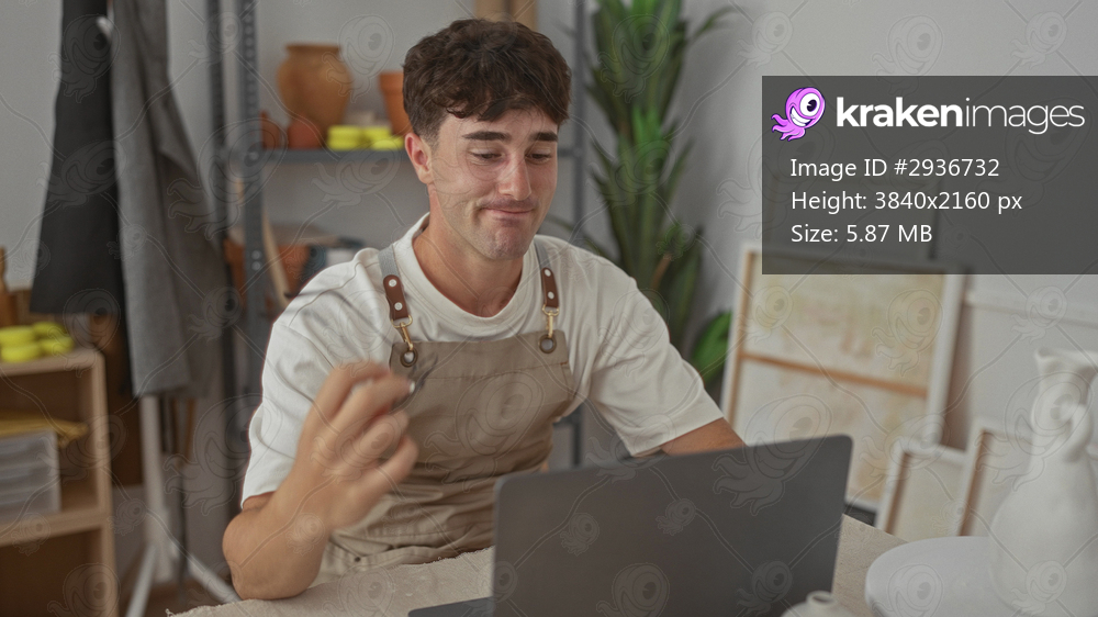 Man holding glasses while using laptop in studio surrounded by pottery and canvases; focused calm productivity.