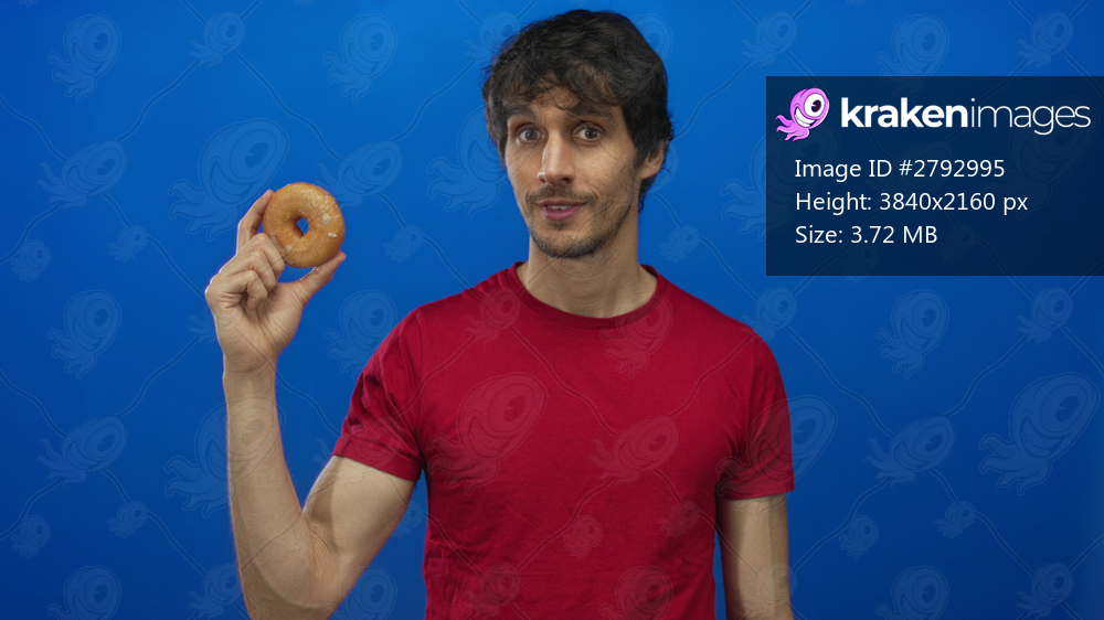 Man holding glazed donut in studio wearing red shirt and looking at pastry with a cheerful grin; joy.
