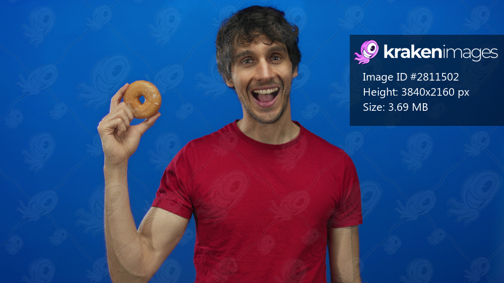 Man holding glazed donut in studio wearing red shirt and looking at pastry with a cheerful grin; joy.