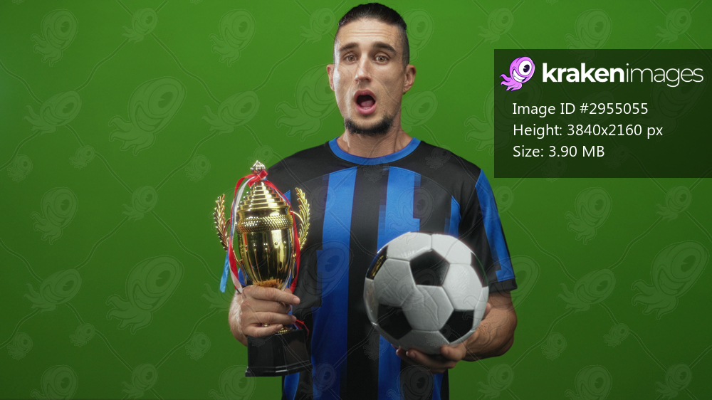 Man holding gold trophy and soccer ball, wearing blue and black striped jersey, eyes closed in quiet celebration in studio; pride reflection.