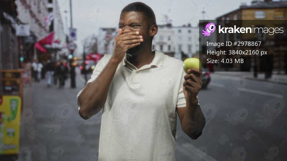 Man holding green apple covers mouth and nose on a busy urban street, eyes closed in recoil; disgust nausea.