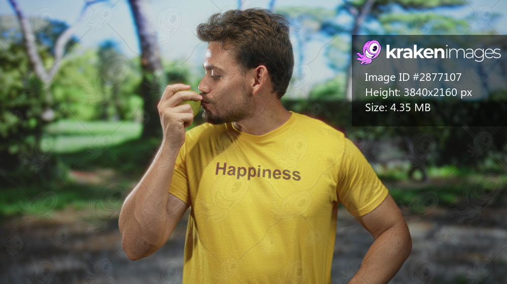 Man holding green apple in park and smiling in yellow tshirt with happiness print; happiness health wellness.