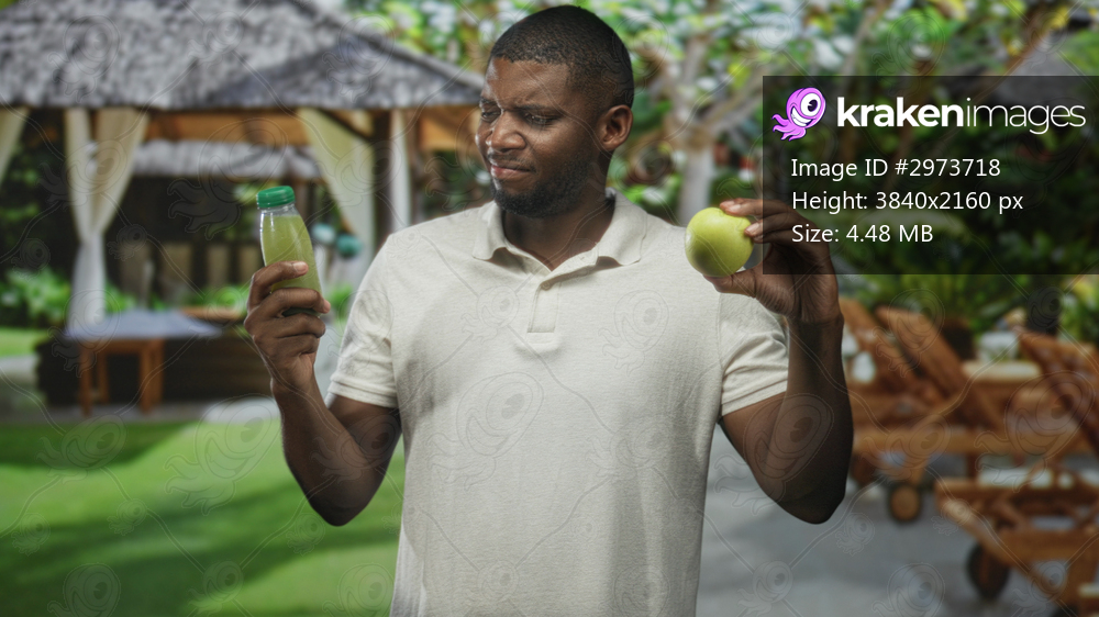 Man holding green apple and juice bottle in studio, resort backdrop and visible grimace; hesitation healthy choice.
