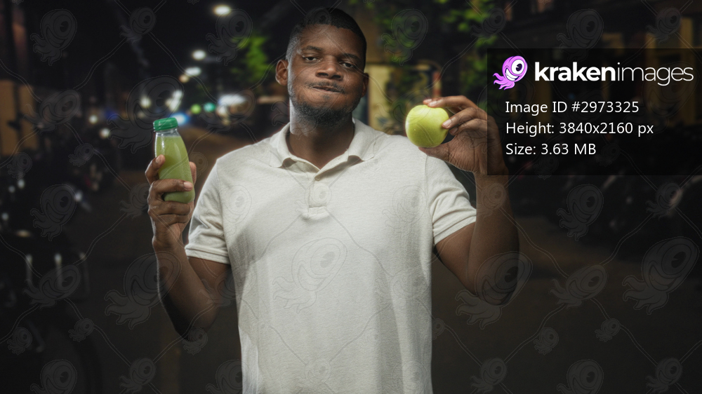 Man holding green apple and juice bottle with lips pressed in a bite gesture while standing on a dim city street at night; healthy choice joy.