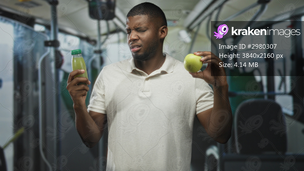 Man holding green apple and juice bottle on a city bus, squinting with a skeptical grimace; hesitation doubt.