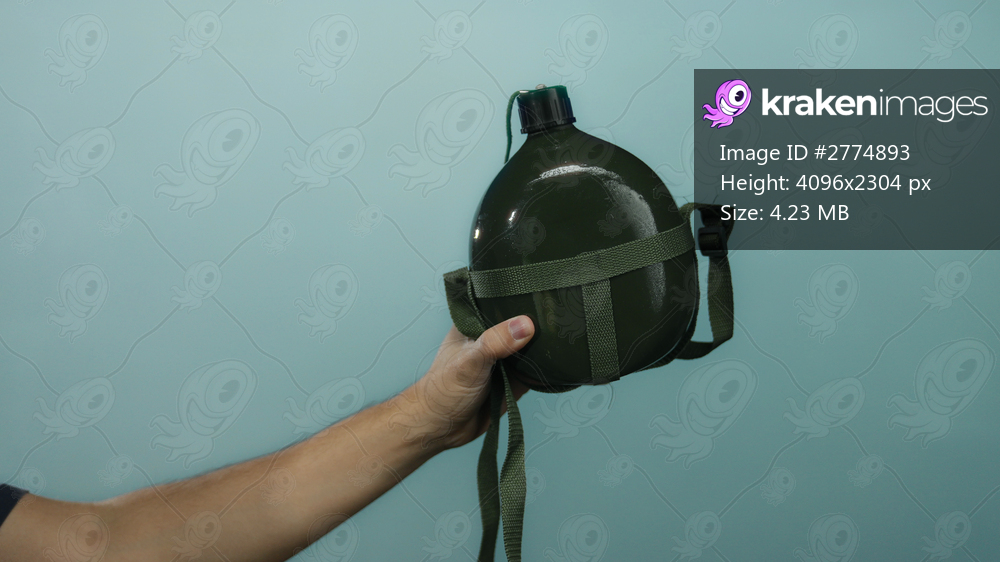 Man holding green canteen in front of blue wall, showcasing an isolated hand gripping military container with strap.