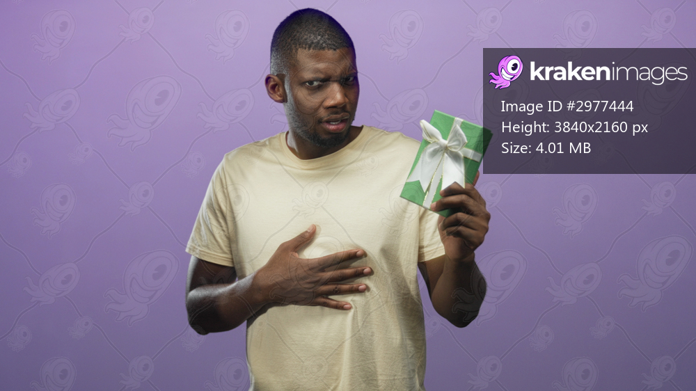 Man holding green gift box with hand on chest and pointing at it in studio; confusion doubt hesitation.