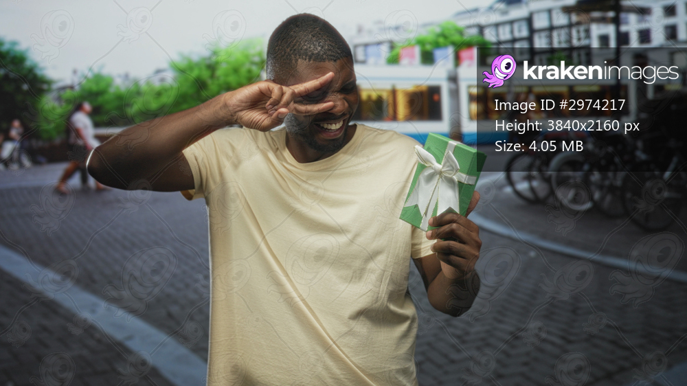 Man holding green gift box and showing peace sign with hand on street near tram and parked bicycles; joy celebration.