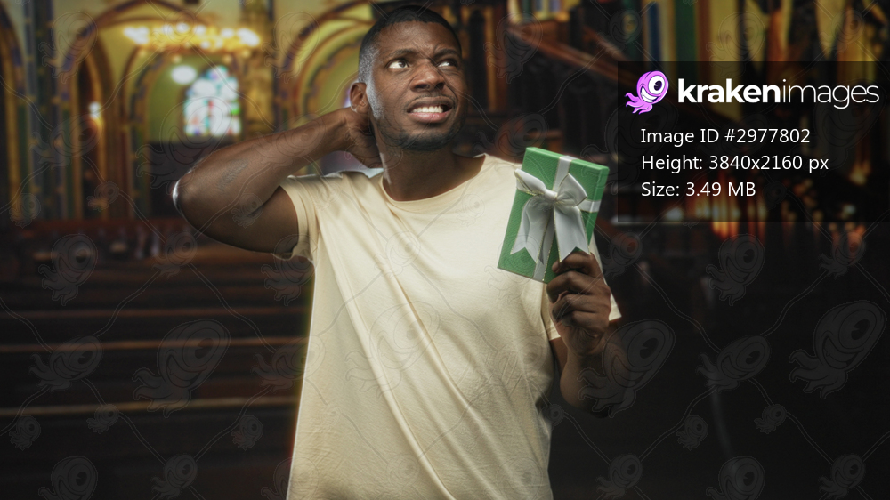 Man holding green gift box with white bow, hand on neck grimace in building; awkwardness uncertainty.